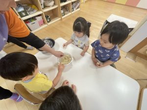 サンライズキッズ保育園では、毎月子どもたちの身近な食材に触れる食育活動に取り組んでいます