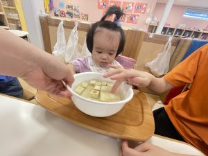 2歳児さんは高野豆腐にプリントされたアンパンマンに夢中