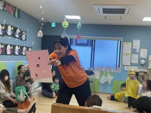 保育者が読むハロウィンの絵本を楽しむ子どもたち