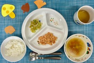 (写真は後期食です。月齢によって形、固さ、盛り付け量を変えて提供しています。)