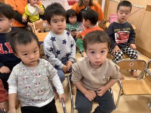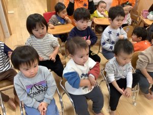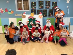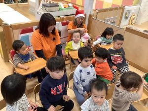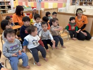 0歳児のお友だちは初めてのサンタさんに驚くばかり