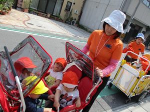 お散歩が大好きな子供たちは、保育士の「お散歩に行くよ~♫」の声に目が輝かせ、次に「靴下をはくよ~」の声に、子どもたちは靴下の入ってるカゴまで一目散![]()