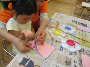 今日、子供たちが絵の具あそびをした画用紙がある形に変身します![]()