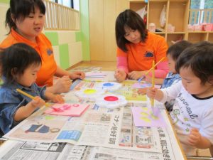 *筆に絵の具を付けて画用紙の片面に「ちょんちょん」と絵の具を付けます。筆を上手に持って真剣な表情!!