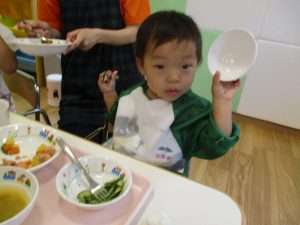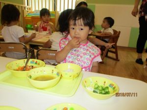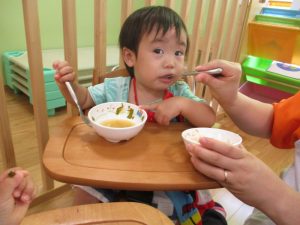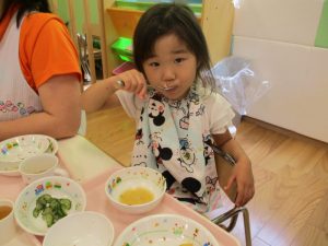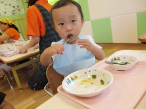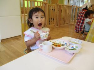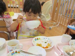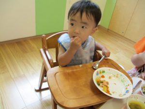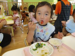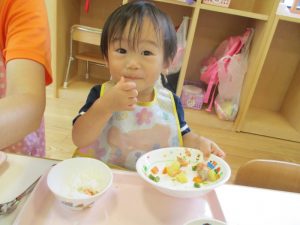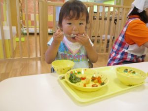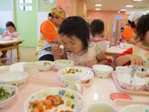 食事の量や好みはそれぞれ違いますが、楽しく食事をする中で苦手な物も子ども達の様子を見ながら少しずつ食べれるようそばで励ましたり、食べようとする姿を褒めたりしていくことで自信をもち、食べる楽しさへと繋げていければと思っています