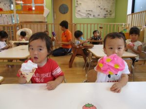 今、朝の会や帰りの会の時に「アイスクリーム」の歌をうたっていて、この歌は子どもたちが大好きな歌の一つです!!