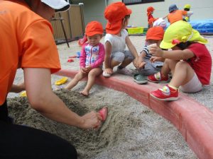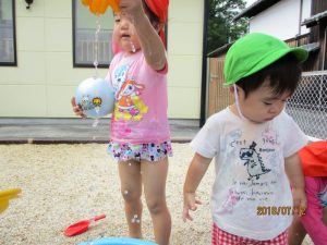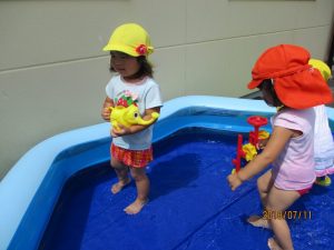 なかには、水がかかる事に抵抗がある子どもさんもおられるので、無理強いはせずに一人一人に合わせて水遊びを進めていきたいと思います。