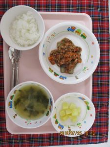 2018.07.25|給食ピックアップ 7月25日(水)のお給食♬ ★離乳食後期★ ・茄子のミートソースかけ ・粉ふき芋 ・みそ汁 ・軟飯 ★幼児食★ ・なすのミートソースかけ ・粉ふき芋 ・みそ汁 ・ご飯 前へ 次へ