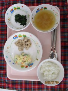 2018.07.30|給食ピックアップ 7月30日(月)のお給食♫ ★離乳食後期★ ・そぼろ煮 ・スティックきゅうり ・モロヘイヤのお浸し ・味噌汁 ・軟飯 ★幼児食★ ・しょうが焼き ・ポテトサラダ ・モロヘイヤのお浸し ・玉葱の味噌汁 ・ご飯 前へ 次へ