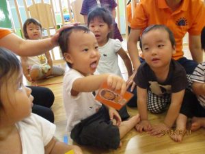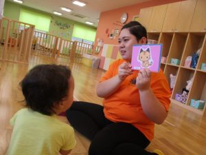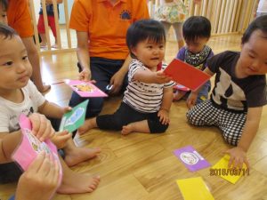 子どもたちが楽しく英語を学べる様にと、動物の絵カードを使って遊びました。