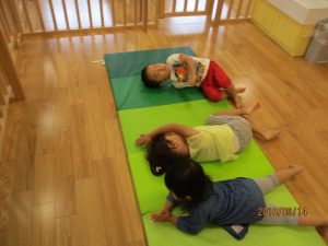 マットの上をロケットのポーズで転がります!!