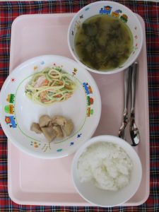 ★幼児食★ ・生姜焼き ・スパゲティ野菜 ・味噌汁 ・ご飯 ・みかん缶