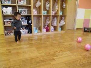 保育者が『それ~!!』とボールを転がすと、ボールをじーと見て・・