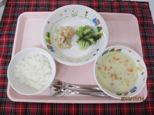 2018.11.14|給食ピックアップ 11月14日(水)のお給食(^O^)/ ★離乳食後期★ ・大豆シチュー ・茹でブロッコリー ・お浸し ・お粥 ★幼児食★ ・大豆のシチュー ・ツナサラダ ・ごはん 前へ 次へ
