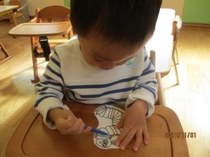① 先ずは、クーピーであおむしや食べ物の絵に色塗りをします。