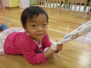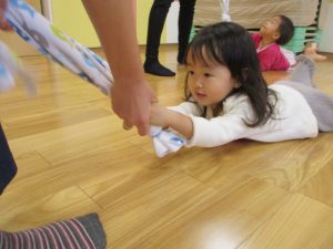 (その時、子どもはうつ伏せになってタオルを握ります。)
