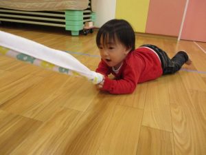 また、新聞紙でいっぱいになった袋を使って『大きなボールができたよ』と言ってボール遊びなんかはいかがでしょうか。