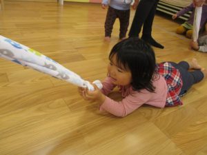 初めてした時は、直ぐにタオルを離していた子ども達も、何度かするうちにコツを掴み、上手に握って前に『ビュ~
