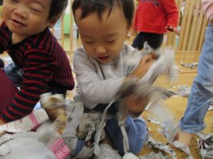 子ども達も破く時の音を楽しんだり・たくさんの新聞に大興奮(≧▽≦)