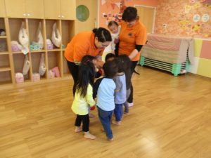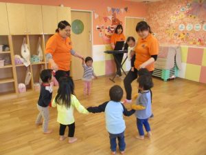 ?1歳児さんは、保育者や2歳児の歌に合わせて手をパンパンと叩いたり体を左右に揺らしたりして楽しそう
