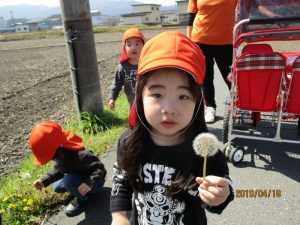 電車を見た後は、田んぼ道に咲いているタンポポや綿毛を見つけて