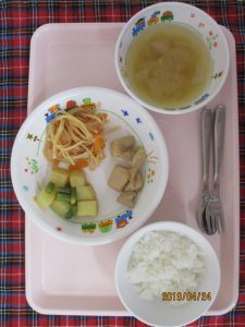 2019.04.25|給食ピックアップ 4月24日(水)のお給食(^O^)/ ?離乳食? ・鶏肉のマーマレード焼き ・スパソテー ・含め煮 ・みそ汁 ・ごはん ★幼児食★ ・鶏肉のマーマレード焼き ・スパゲッティソテー ・含め煮 ・ごはん ・みそ汁 前へ 次へ