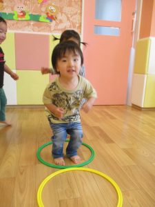 両手に持って歩いて運んだり・フープの中をジャンプしたりと、