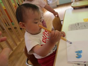 絵の具の付いた筆を画用紙の好きな所に模様を付けていきます!!