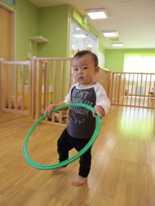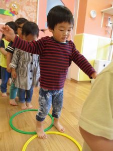 両手に持って歩いて運んだり・フープの中をジャンプしたりと、