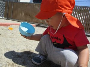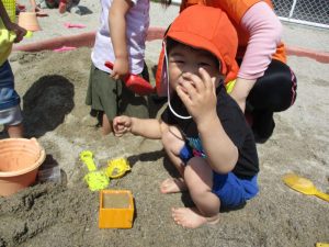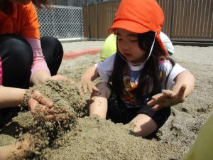 山を作って穴を掘ったり、バケツや型抜きを使って遊んだり、