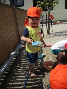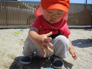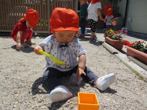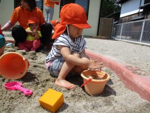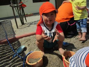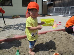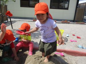 2歳児の?ぐみは、園庭の砂場で裸足になって遊びました。