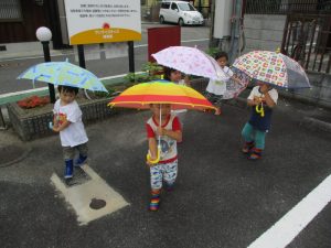 事前に保護者の方に雨が降った日に傘を持って来ていただくようお願いをし、