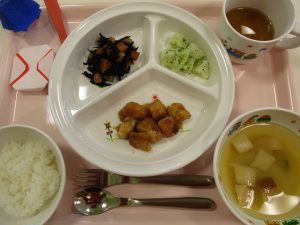 ご飯 味噌汁 アジのかば焼き ひじきの炒り煮 粉ふき芋