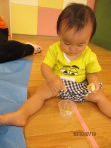 上手にちぎってカップの中に入れるという動作を