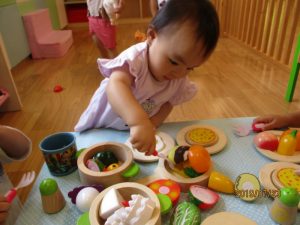 これは、保育者やお友達と一緒にままごと遊びをしている所です。