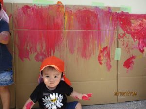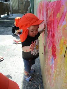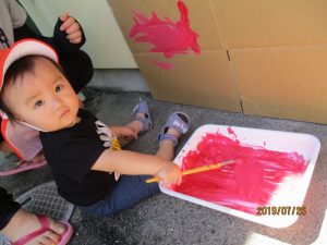 お次は、2歳児さんと一緒に絵の具遊びをしました!!