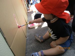 大きな段ボールを園庭の一面に貼り、