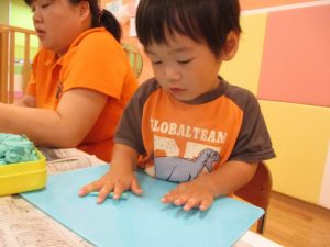 ?組さんは何度も粘土を使って遊ぶ経験をしているので、手のひらで細長く伸ばしたり・丸めたり色々な形を作る姿が見られました。