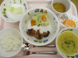 ご飯 コーンスープ ローストチキン ポテトサラダ りんご