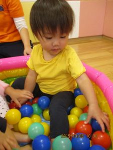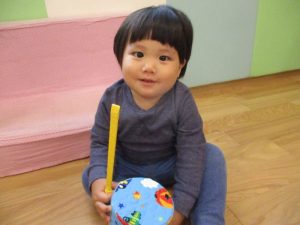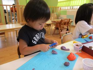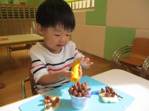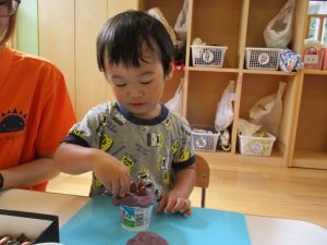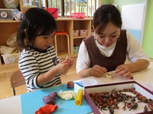 この日の活動は2歳児?組は、リトミック後に小麦粉粘土とドングリを使っての造形遊び、