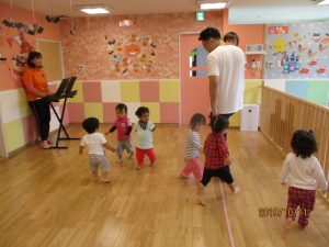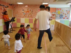 お父さん先生と一緒にピアノの音に合わせて