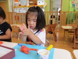 食紅で色付けをした小麦粉粘土を使って遊びました。