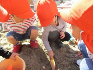 園庭の砂場に保育士が家から持ってきたサツマイモを