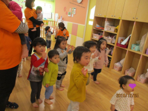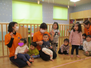 ?を貰ってハイタッチをして直ぐに保育者の元に戻る?ぐみさん・・