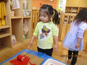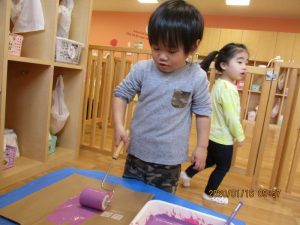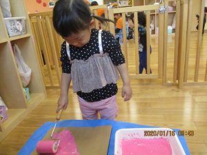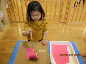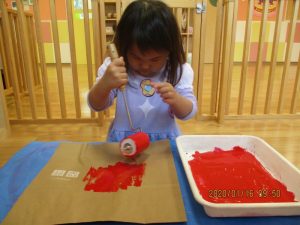 ローラーに絵の具を付けて、紙袋に色付けをしていきます。