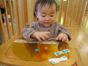 シールの色を2種類用意し好きなところにペタペタと真剣に