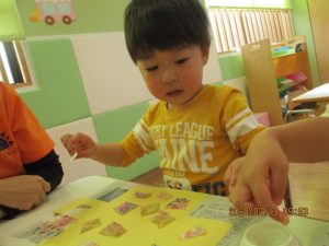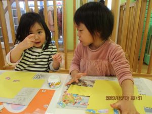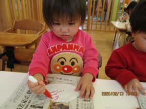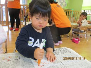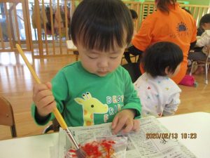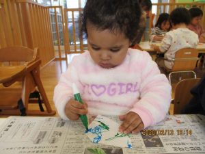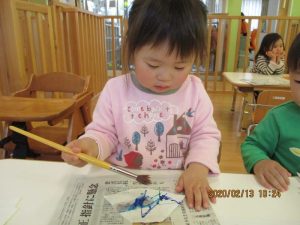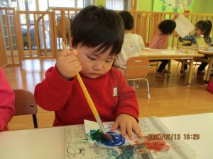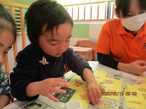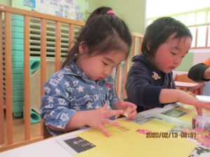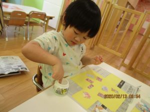 保育者がそばで声をかけながら糊の使い方や塗り方を伝える事で最後まで仕上げる事が