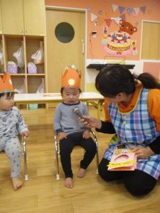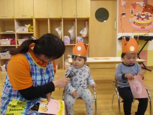 保育士手作りの冠を被ってみんなの前に座ってもらいましたが、