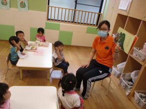 給食前で椅子に座ってスタンバイをしている時間を使っての
