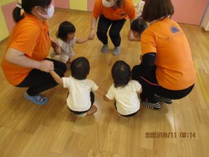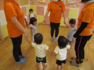 お友だちと先生と手をつなぎ歌に合わせて![]()